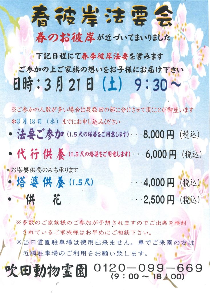 当園へのアクセス お知らせ お子さまを亡くされたら ご火葬・ご葬儀 ご火葬料金について ご火葬プランとご葬儀の流れ ご供養について 納骨のご案内 法要のご案内 ご家族さまの声 よくあるご質問 当園のご案内 アクセス 施設紹介 会社概要 採用情報 0120-099-669 お知らせ ホーム > お知らせ > 2026年 春彼岸法要会のご案内 Information&Topics 2026年 春彼岸法要会のご案内 2026/02/20 ≫ informationの一覧に戻る カテゴリー お知らせ